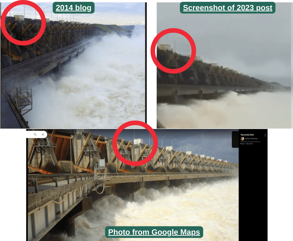 The blog post contains a photo showing a structure with similar features to the dam seen in the misleading video. Further search on Google Maps led to several photos of the Yacyretá Dam in higher resolutions.