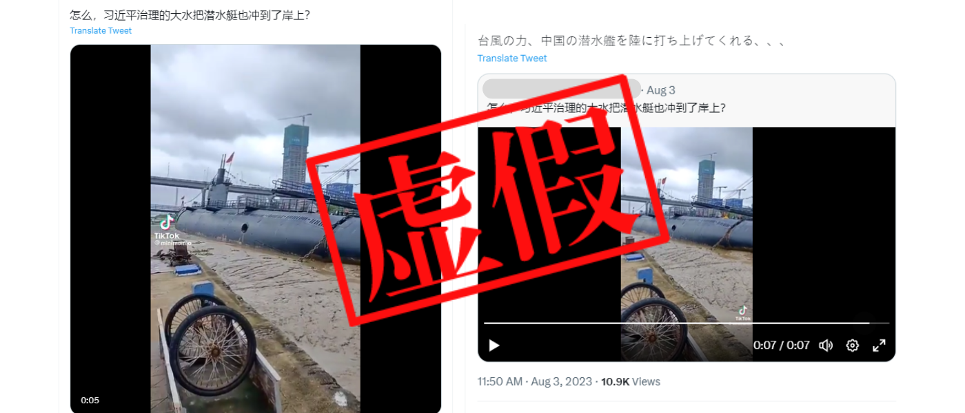 8月初中國北方多個地區包括湖北省、北京和黑龍江省等因颱風杜蘇芮而暴雨成災,導致最少數十人死亡。在社交平台X(前稱Twitter)上多個中文帖子聲稱有潛水艇被大水沖到岸上。相關影片可見一艘船身掛有中國國旗的潛水艇,卡在淺水泥濘之處。發文的用戶並諷刺質疑國家主席習近平治理洪水的成效。