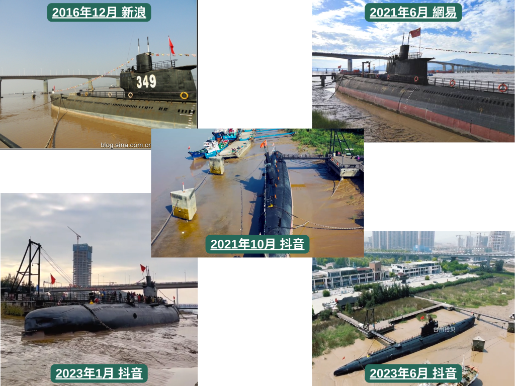 以編號「349」和「潛水艇」作為關鍵字搜尋,可以找到很多和「349潛艇觀光基地」相關的網頁。參考其他網民上傳到抖音的349潛艇觀光基地影片,可以見到網傳影片中的未完工大樓以及大橋,證明儘管網傳影片曾經鏡像翻轉的後期處理,但網傳影片的潛艇即為349潛艇,一直位處相同地點。