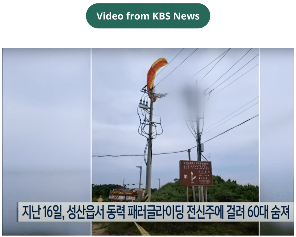 We checked the original source cited in the forum and the article from the news outlet Kookmin Ilbo, which said the accident involved a 60-year-old paraglider who died after hitting a 16m high-voltage wire in Seopjikoji beach, Jeju.