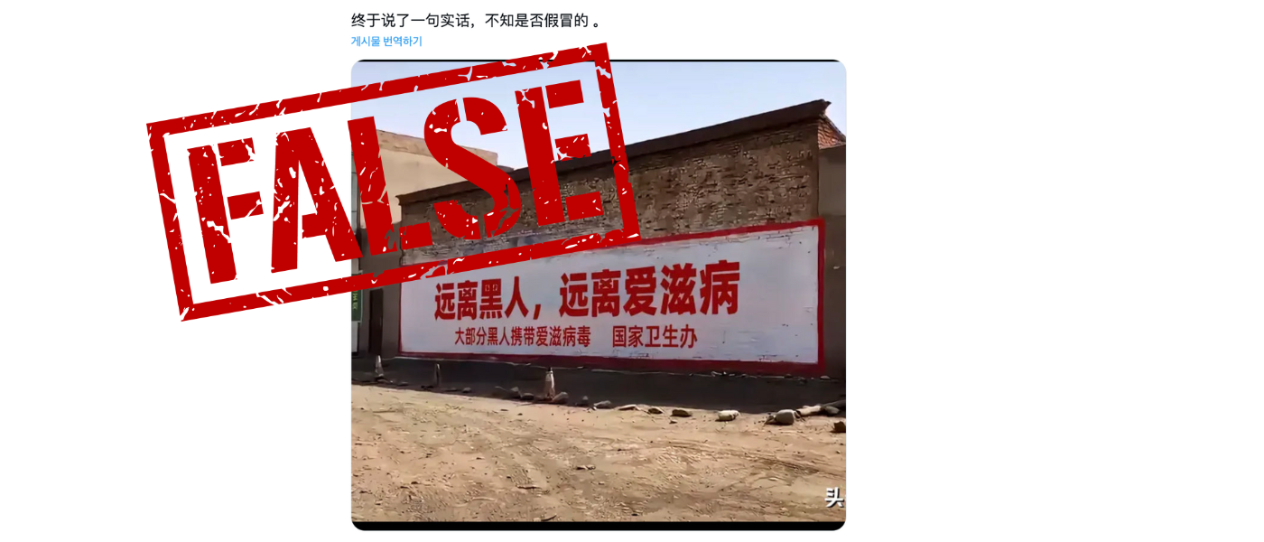 A post on X shared an image of a wall slogan written in Chinese, “远离黑人, 远离爱滋病” which translates to “stay away from black people, stay away from AIDS.”