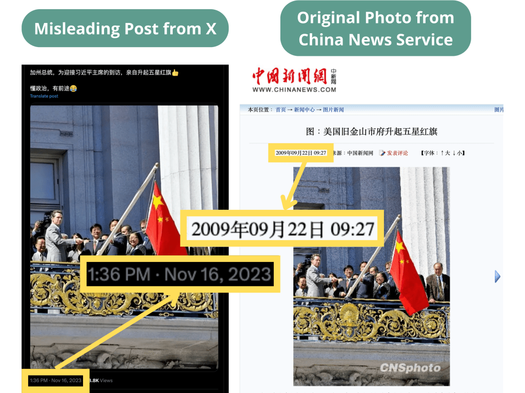 A photo showing California Governor Gavin Newsom raising the Chinese national flag was widely circulated on X, Baidu and Weibo last month with a claim that he did this to welcome President Xi Jinping during the Asia-Pacific Economic Cooperation Leaders’ Week summit in San Francisco.