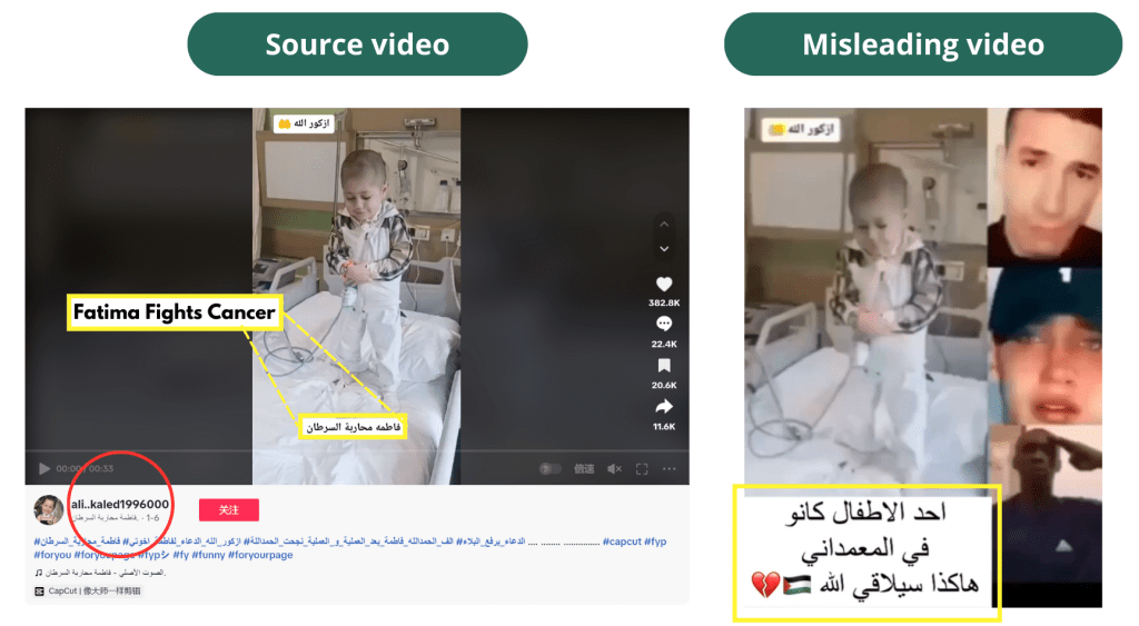 The account called “ali..kaled1996000” posted the source clip with a text in Arabic that reads, “Fatima fights cancer.” These words are covered by another overlaying text in the misleading video.