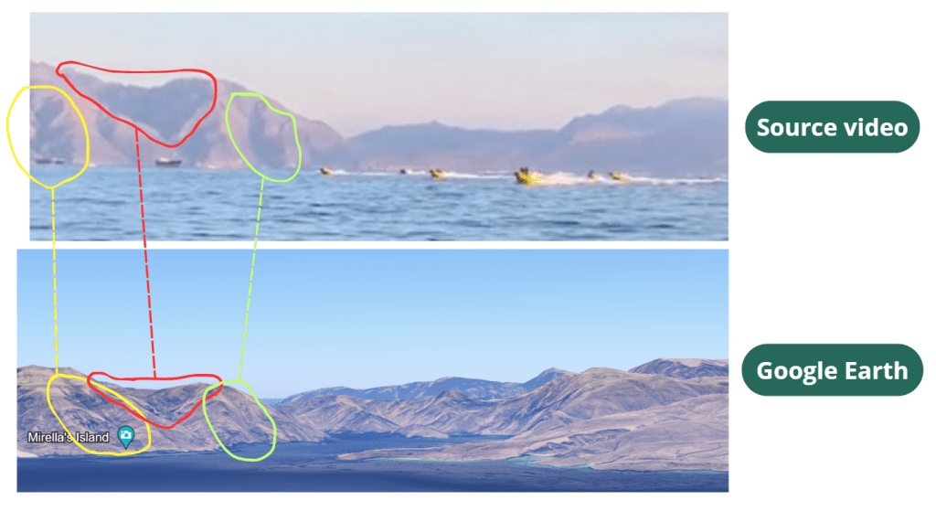 We tried to geolocate the place on Google Earth and found that the mountains seen in the background of the video are likely situated between Mirellas’s Island and Khasab Castle in Khasab.