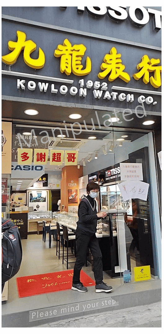 An image allegedly showing the Kwun Tong branch of Kowloon Watch Co with a sign that says “多謝超哥” (“Thank you, John Lee”) was widely shared through local Facebook groups and media outlets such as Dimsum Daily in mid-March.