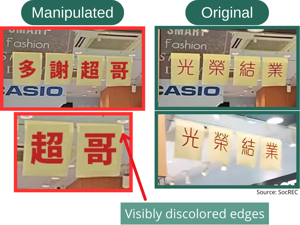 The manipulated image appears to have visible traces of digital manipulation — the background color of the new text does not fully blend into the light yellow of the paper used for the sign, leaving distinctive discoloured edges.