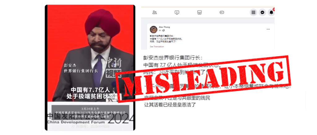 The image features Banga speaking at the recently held China Development Forum 2024, and its Chinese subtitle reads, “China has 770 million people in extreme poverty” when translated to English.