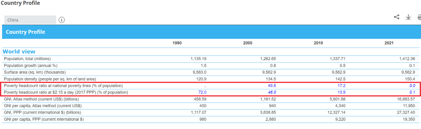 We also checked the data from the World Bank, which shows that the percentage of the population living below the national poverty line reached near zero in China in 2021, a big drop from 17.2% in 2010.
