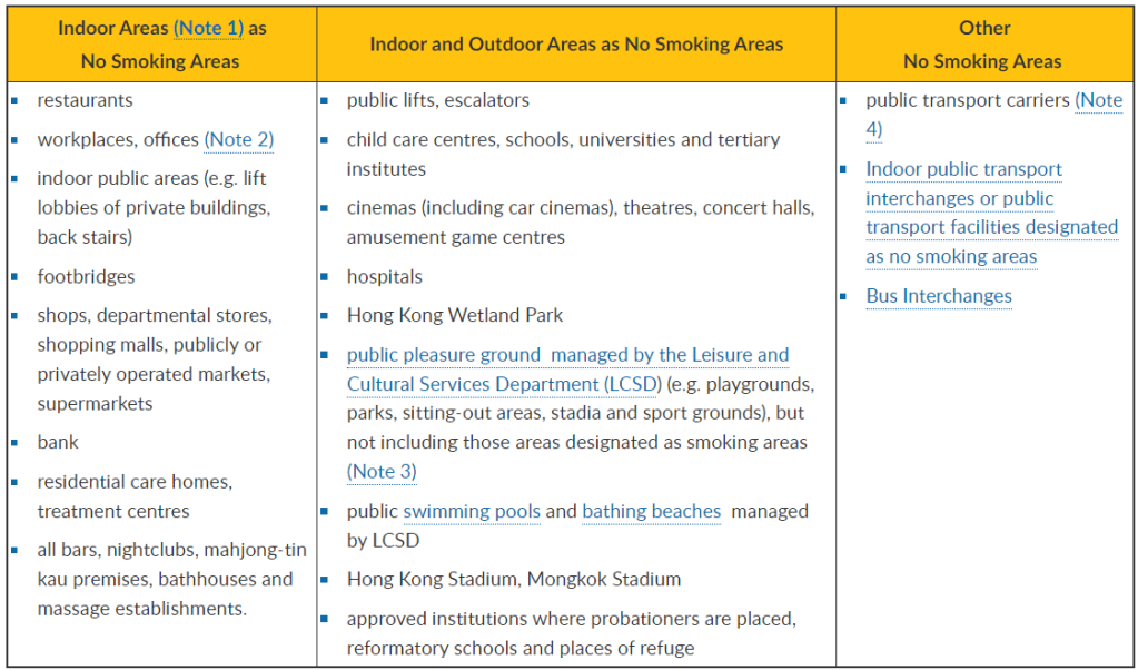 The statutory no-smoking areas include indoor areas of restaurants, shops, shopping malls, bars, and nightclubs. Certain facilities with outdoor areas, such as hospitals, schools and parks, as well as public transport facilities, are also covered.