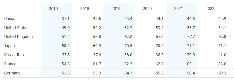 世界银行数据显示,2022年中国的抚养比为44.9%。网传不实说法中提到的其他六国数据如下表所示: