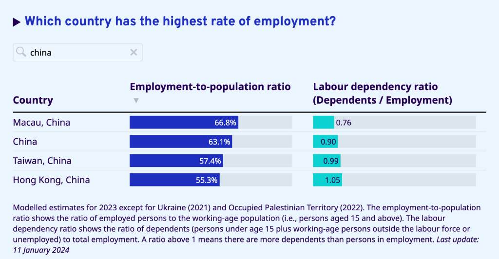 与此同时,国际劳工组织在其在线数据库中解释说,劳动抚养比是指“受养人口(15岁以下人口,以及劳动年龄段中非从事经济活动人口或失业人口)与总就业人口的比率。” 数据库显示了许多国家“就业人口比率”和劳动抚养比的建模估值。 2023年,中国大陆的就业人口比率估算为63.1%,劳动抚养比为0.90。