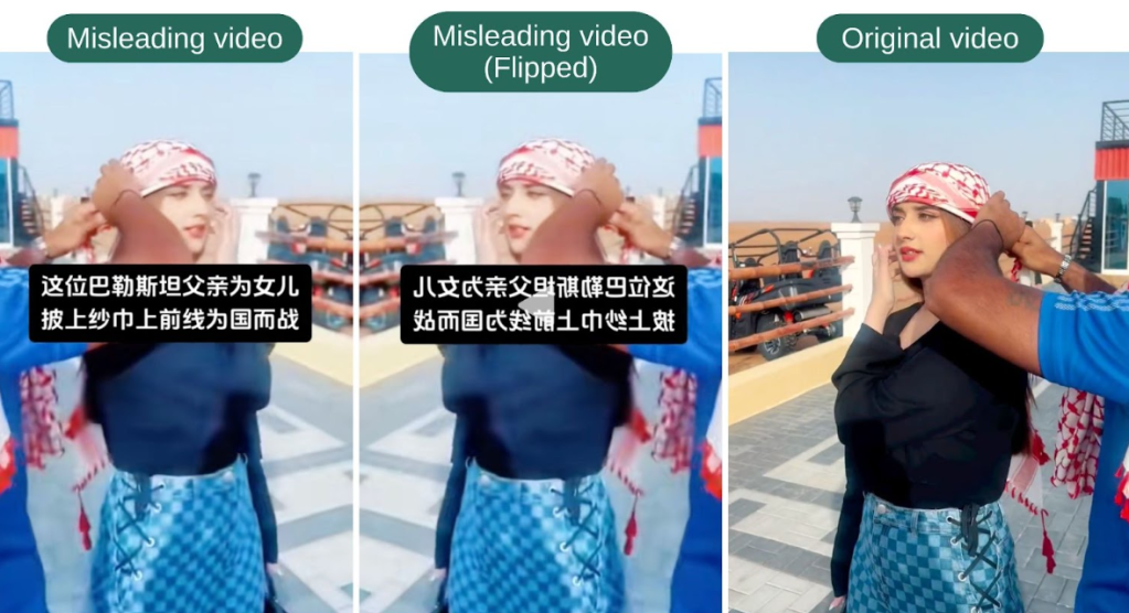 A short video clip showing a man putting a keffiyeh, a traditional Arab headdress that has become a symbol of Palestinian resistance, on a young woman has been shared thousands of times on Chinese social media, alongside a claim that it shows “a Palestinian father getting his daughter, a Hamas soldier, ready to fight in the war.”