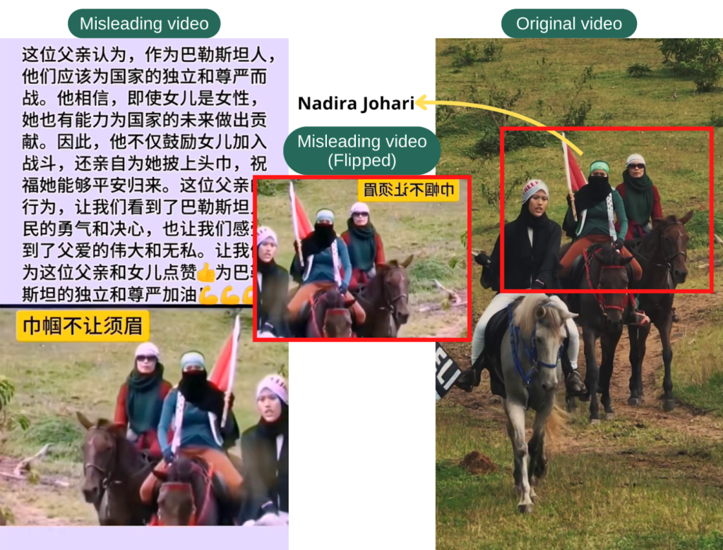 In the more recent Douyin videos, the clip of the Pakistani influencer is combined with another clip which shows women in Islamic clothing riding horses and carrying a Palestinian flag.