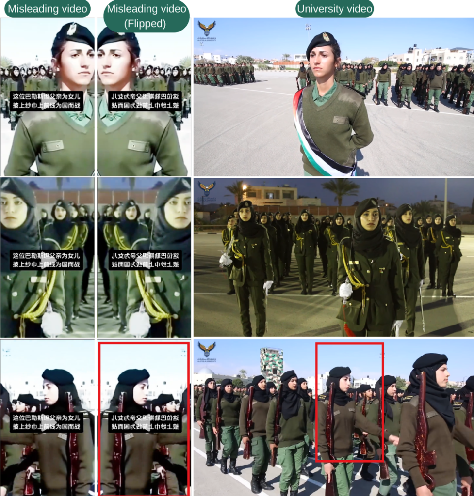 Google reverse image searches found that the clips of women in “military uniforms” actually show graduation ceremonies at Al Istiqlal University in the West Bank, taken years before the war in Gaza started.
