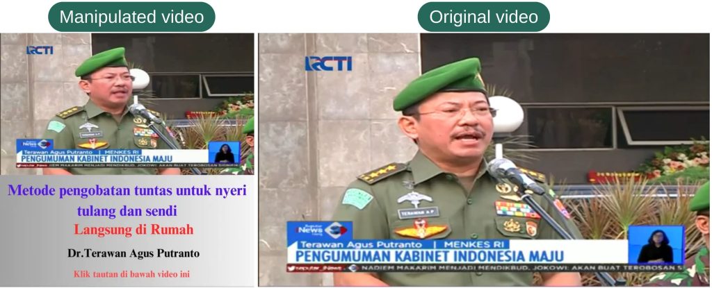 However, the video has been manipulated, seemingly with generative AI tools for voice cloning and lip-sync. Terawan, a radiologist who worked as a military physician and briefly took office as health minister between October 2019 and December 2020, mentioned nothing about any health products in the original video.