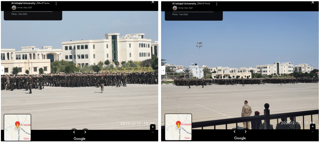 经过谷歌反向图像搜索发现,这些穿着“军装”的女性视频实际上是位于巴勒斯坦西岸的Al Istiqlal 大学的毕业典礼拍摄,时间比新一轮加沙战争早了几年。Al Istiqlal 大学是一所以安保、军事和警察科学等学科为主的公立大学。