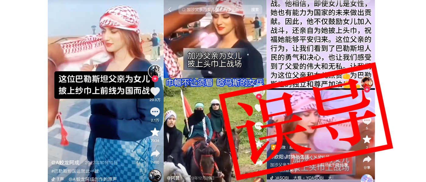 Annie Lab发现在2023年10月15日、即以色列和哈马斯开战几天之后,便有人把视频发布于抖音,时长18秒。前 11 秒显示一名男子为一名年轻女子的头戴头巾,视频中的文字写道: “这位巴勒斯坦父亲为女儿披上纱巾上前线为国而战”。视频的接下来则展示身穿疑似军装的女性军训会操和列队站立的镜头。