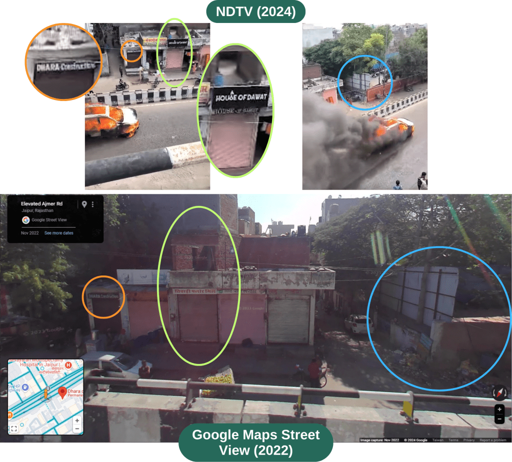 The NDTV video shows a store sign “Dhara Constructions.” Annie Lab could locate the store on Ajmer Road in Sodala. Buildings seen on Google Street View imagery match those seen in the videos.