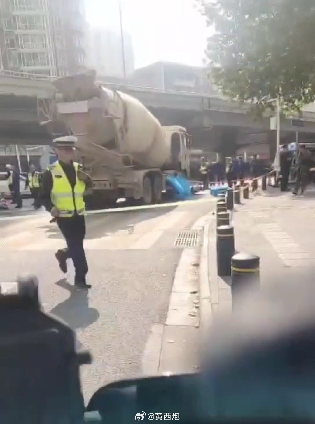 The Weibo post said, “A cement mixer was involved in an accident yesterday morning at the intersection of Jiefang Boulevard and Hong Kong Road. Numerous ambulances and fire rescue trucks were at the scene. The front wheels of the mixer truck were covered with a cloth, blocking bystanders’ view.”