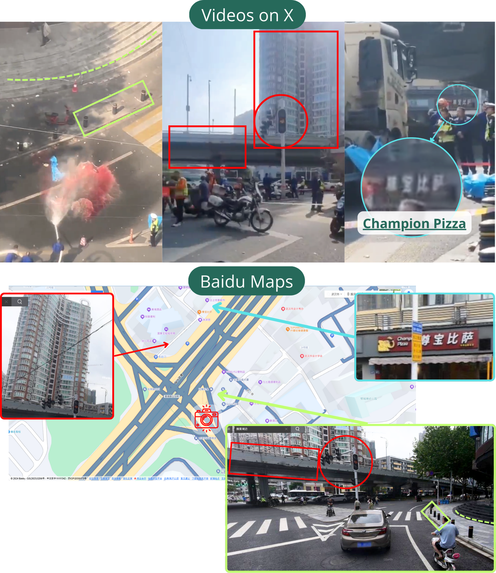 For instance, the video shows a pizza shop, “尊宝比萨,” also known as the Champion Pizza, across the intersection. We found the same Champion Pizza store on Baidu Maps.