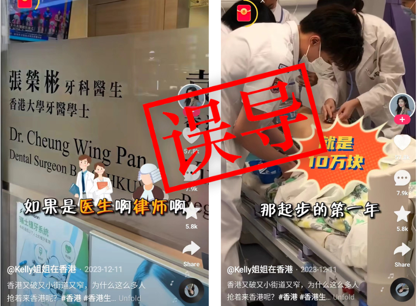 内地网络失实描述两地工资差距的言论,亦有不少聚焦在香港个别薪酬明显较高的行业,例如金融和医疗等。比如快手上的一条热门视频称,香港的医生和律师”起步第一年”每月工資就有10万港元,获得了近6万点赞。