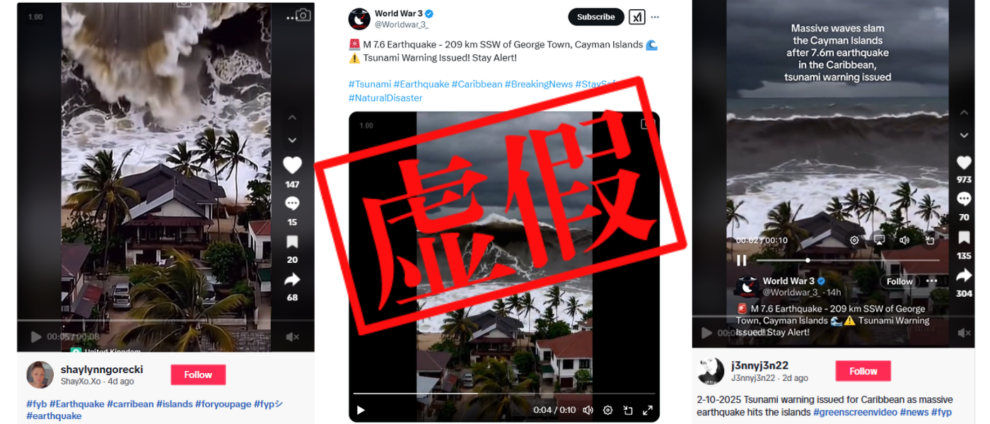 2月10日,有社交平台X(推特)用户发布一条疑似海啸的视频。视频中乌云密布,高耸的海浪拍向岸边,相当接近周遭的房屋和树木,同时视频中也可听到海啸轰鸣声和警报声。视频英文文案提及距开曼群岛乔治敦港西南偏南方向209公里处发生7.6级地震,提醒海啸预警已发布及注意避险。