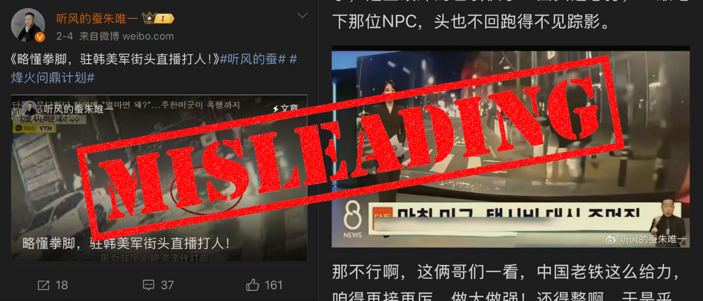 A post on Weibo dated Feb. 4 alleged that a U.S. military person was involved in a violent street brawl in South Korea. The post included two screenshots purportedly taken from Korean TV news reports showing the incident.