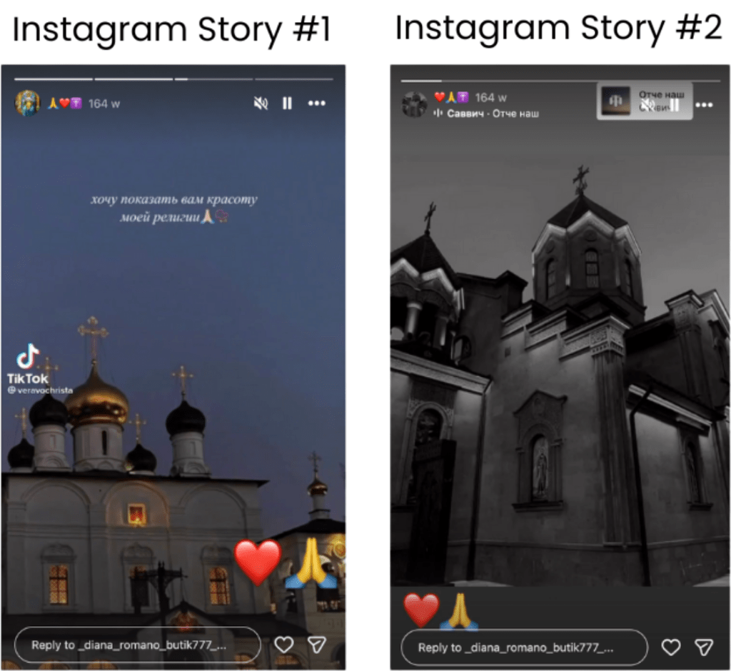 Additional story highlights (here and here) feature Orthodox Christian churches, Bible verses, and religious imagery, displaying their Christian faith.
