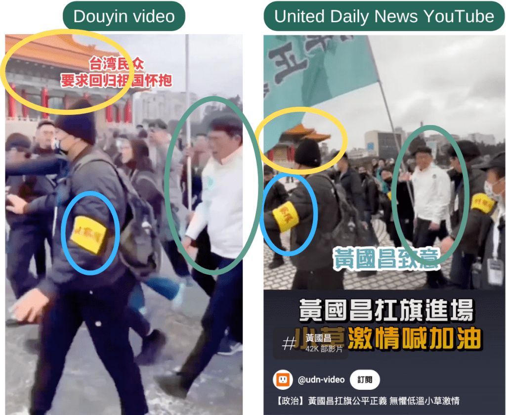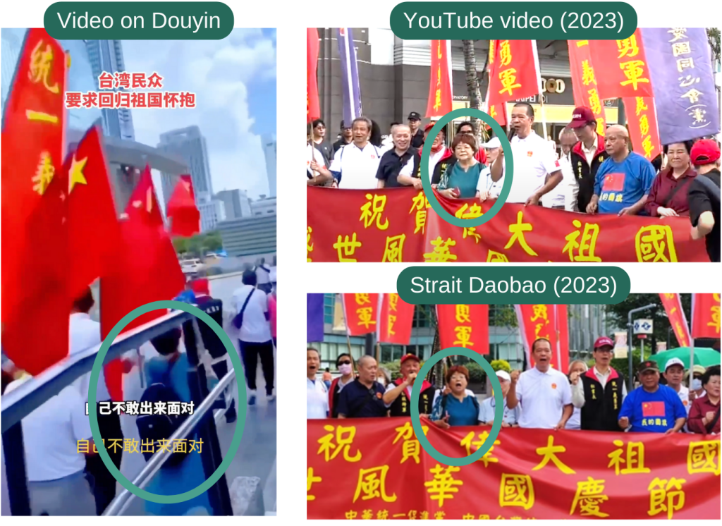 A woman in a red vest and a yellow top is also visible, confirming that the event was filmed in Taiwan and hosted by pro-China supporters.