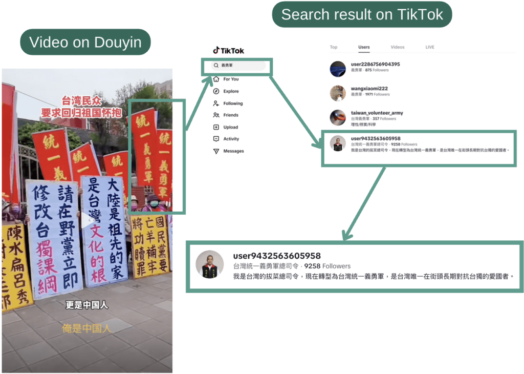 Individuals are seen holding banners with the words “統一義勇軍 (Unification Volunteer Army).” A keyword search on TikTok led to an account identifying itself as the “台灣統一義勇軍總司令 (Commander-in-Chief of Taiwan’s Unification Volunteer Army),” which uploaded the original footage (archived here).