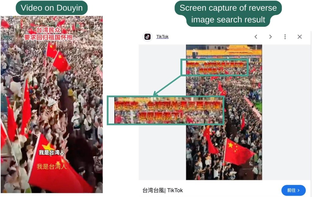 A reverse image search and further keyword search led to a TikTok video (archived here) showing the same scene in higher resolution. Chinese text reads, “Taiwan is full of five-star red flags fluttering in the wind.”