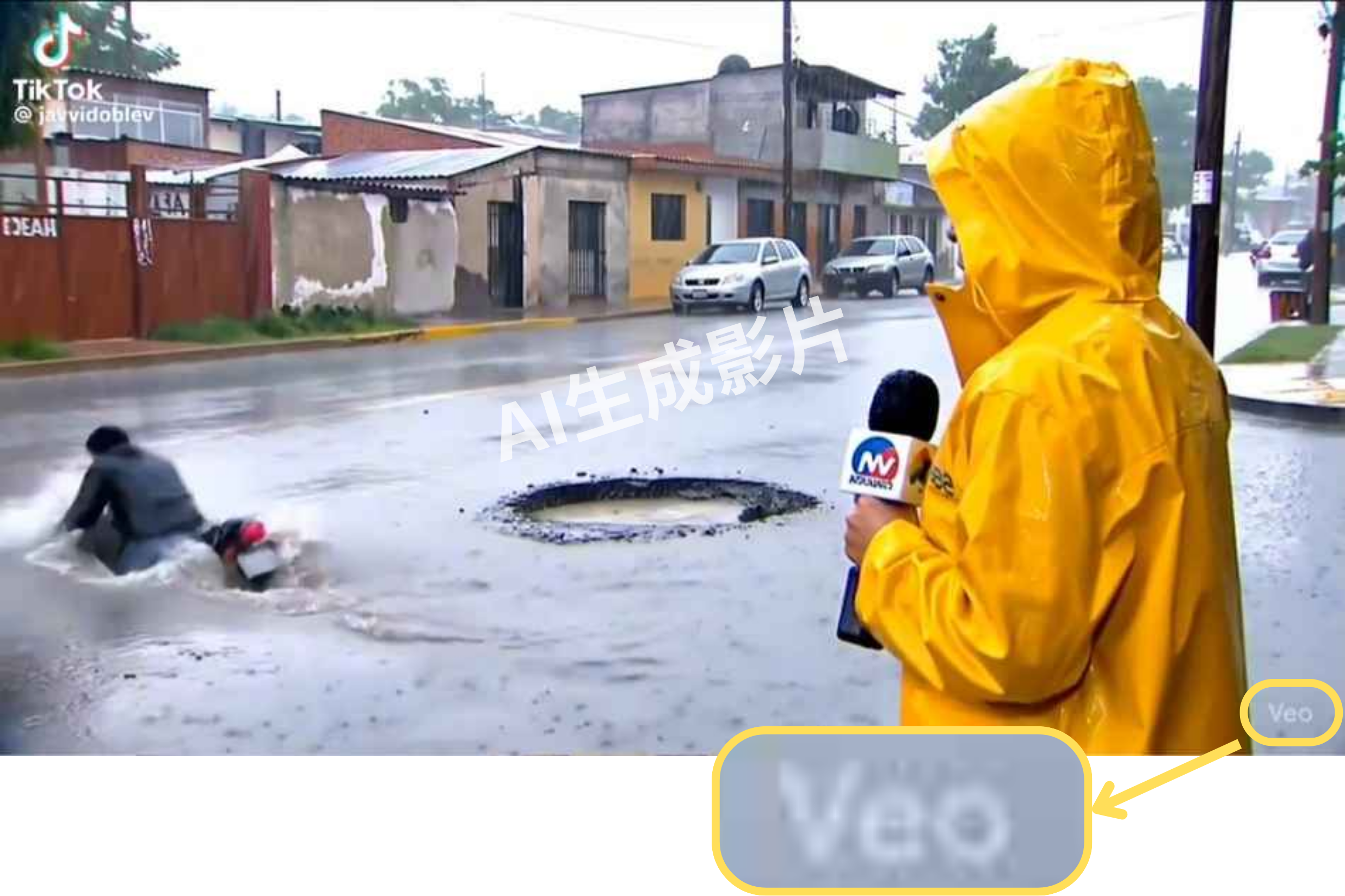 這類「淹水路陷」AI影片似乎是一種新的網絡潮流。Annie Lab在Instagram發現另一段類似的Veo短片,聲稱顯示危地馬拉市的水浸報道場景。