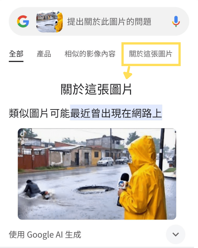 雖然單憑此水印並不能完全確認影片由Veo生成,因為這類標記可以經後製篡改到真實影片中,但在Google搜尋器使用「以圖搜圖」功能時,「關於這張圖片」的頁面(備份連結)確認影片是「使用Google AI生成」。搜尋結果還會顯示Google首次為偵測到該圖片的時間,顯示網傳影片的截圖最近才出現在網路上。