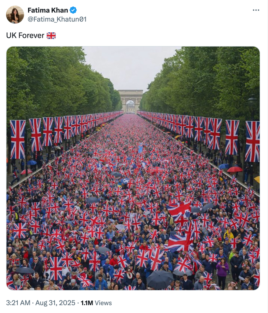 However, this image does not show the protest organized by political activist Tommy Robinson in mid-September. Many signs indicate that the news image was created by a generative AI tool.