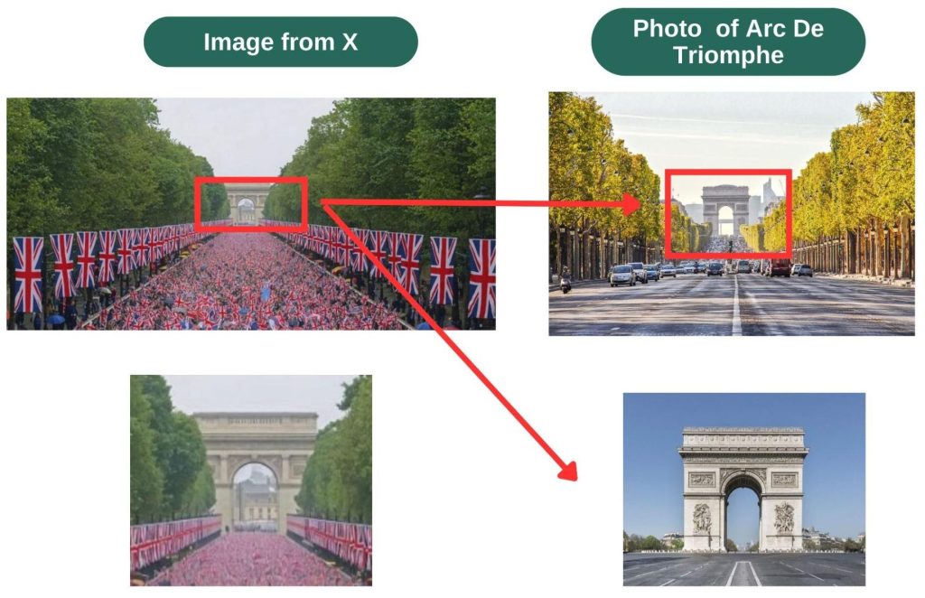 A reverse image search, for example, reveals that the image’s background features a structure that resembles the Arc de Triomphe in Paris, France.