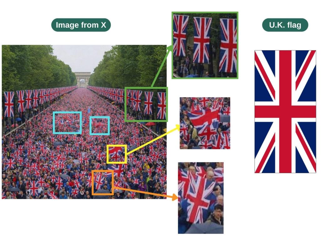 Another telltale sign was the U.K. flags in the image, some of which are distorted with blurred elements, merged patterns (highlighted in blue), and inconsistent designs (highlighted in green, yellow, and orange):