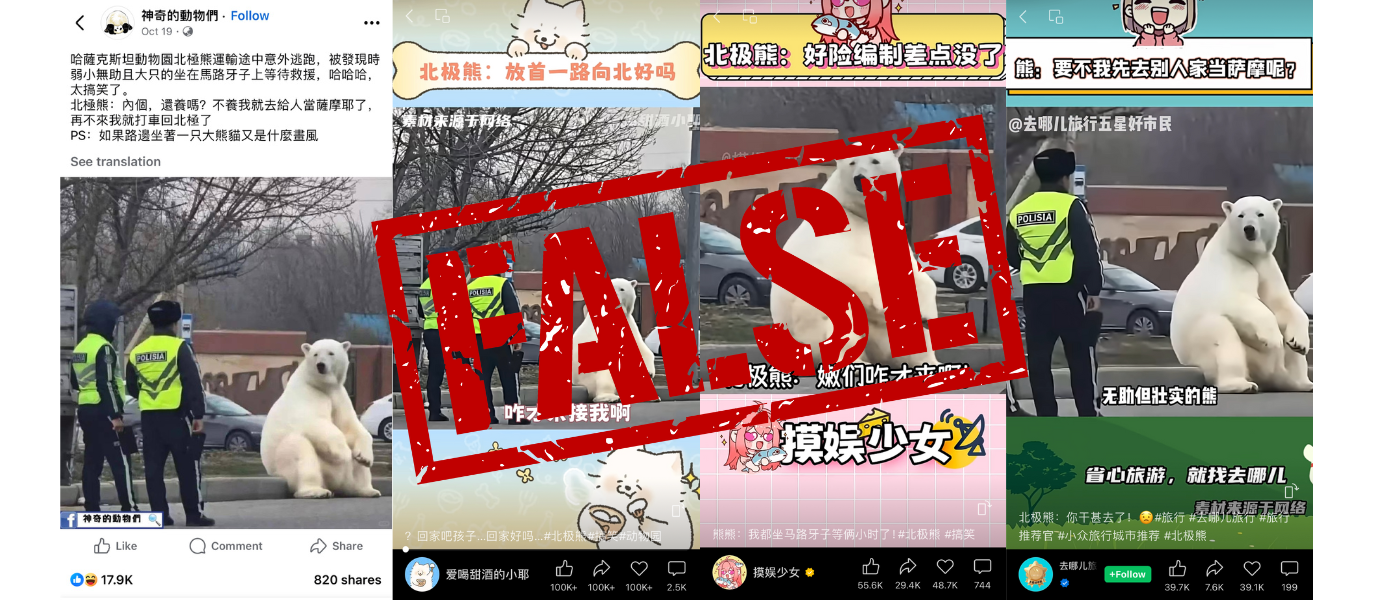 An image circulated widely in early 2025 on Chinese social media claiming that a polar bear purchased by a zoo in Kazakhstan had escaped during transport and was later recaptured after a police search.