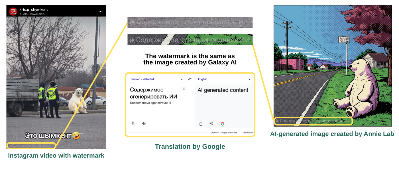 The Instagram image, posted by seemingly a local account in Shymkent, the third-largest city in Kazakhstan, included a Russian disclaimer in the bottom-left corner reading “AI-generated content,” along with a Galaxy AI watermark from Samsung.