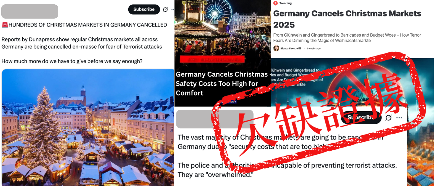 自10月中旬起,大量社交媒體帖文聲稱,由於保安成本日增,德國取消了2025年的大部份聖誕市集。