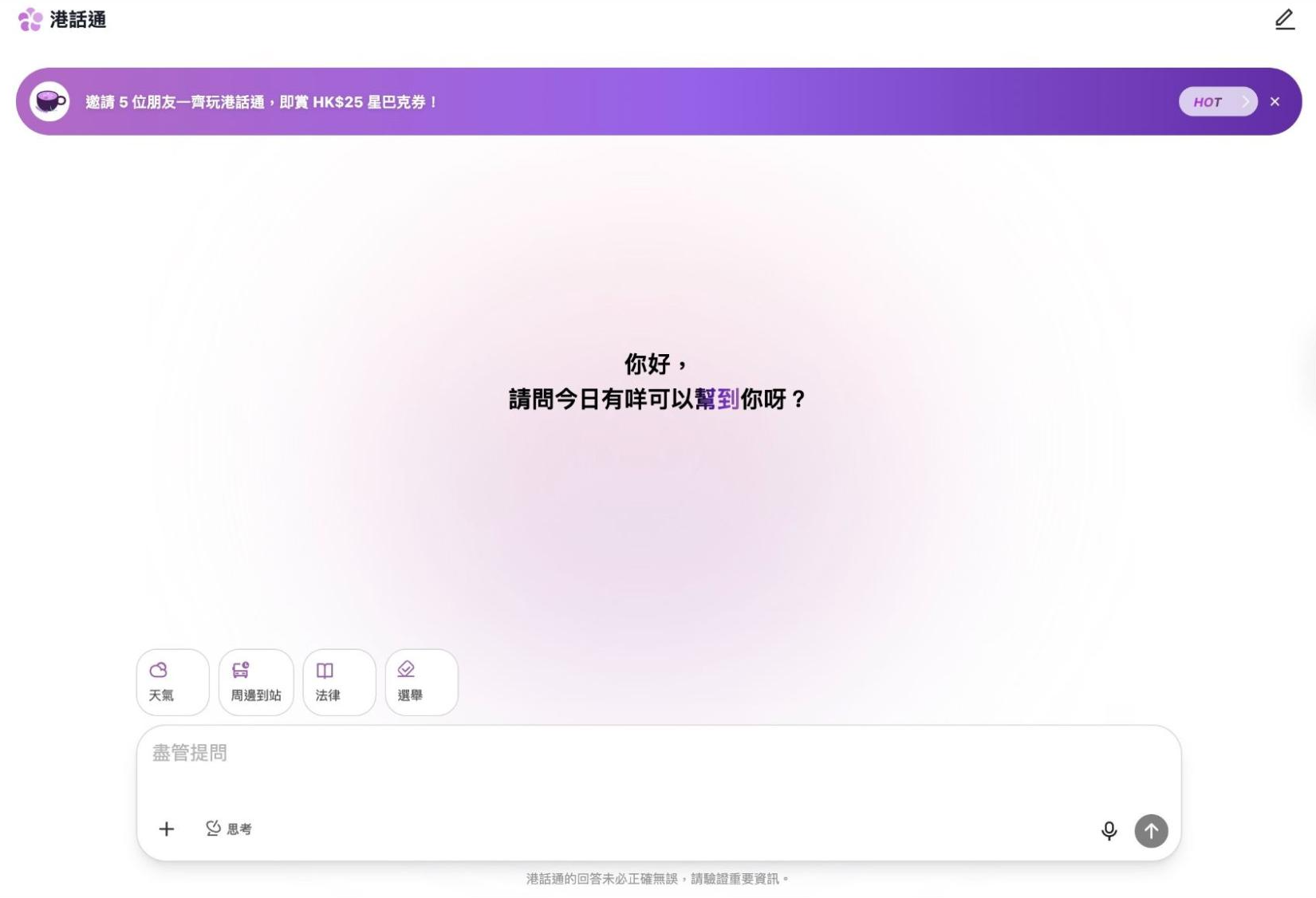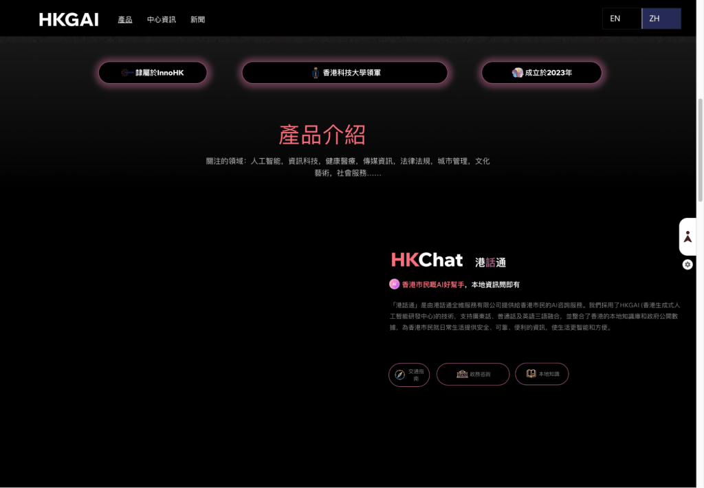 2025年2月,HKGAI發布香港首個大語言基礎模型HKGAI V1,該模型以DeepSeek(深度求索)系統為基礎進行本地化和微調,並研發其他HKGAI V1模型為基礎的應用程式,包括文書處理工具「港文通」(HKPilot、備份連結)、聊天機械人「港話通」(HKChat),以及為政府部門提供法律文件支援的「港法通」(LexiHK)。