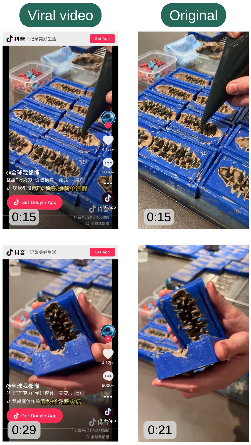 Meanwhile, from 0:34 to 0:40, the viral video incorporates footage from another Douyin post by an industrial food processing machinery supplier advertising silicone molds used to produce vegan sea cucumbers.