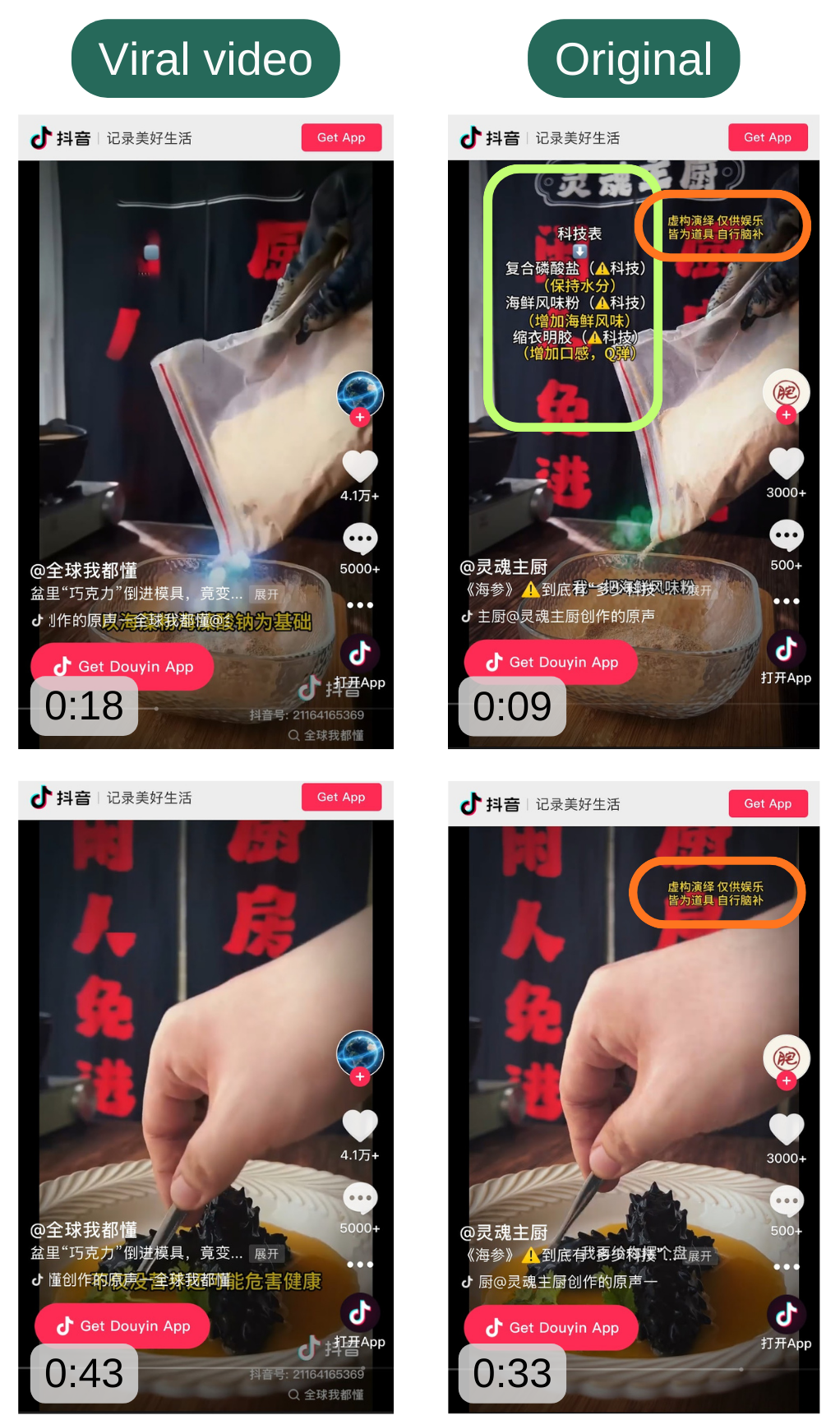 From 0:16 onward, the viral video collage uses footage taken from a recipe video posted on Douyin by a creator who focuses on food safety awareness and exposé. Segments providing step-by-step instructions for mixing ingredients such as flour, konjac, and additives for flavor, visual appeal, and texture to make imitation sea cucumbers were edited into the video.