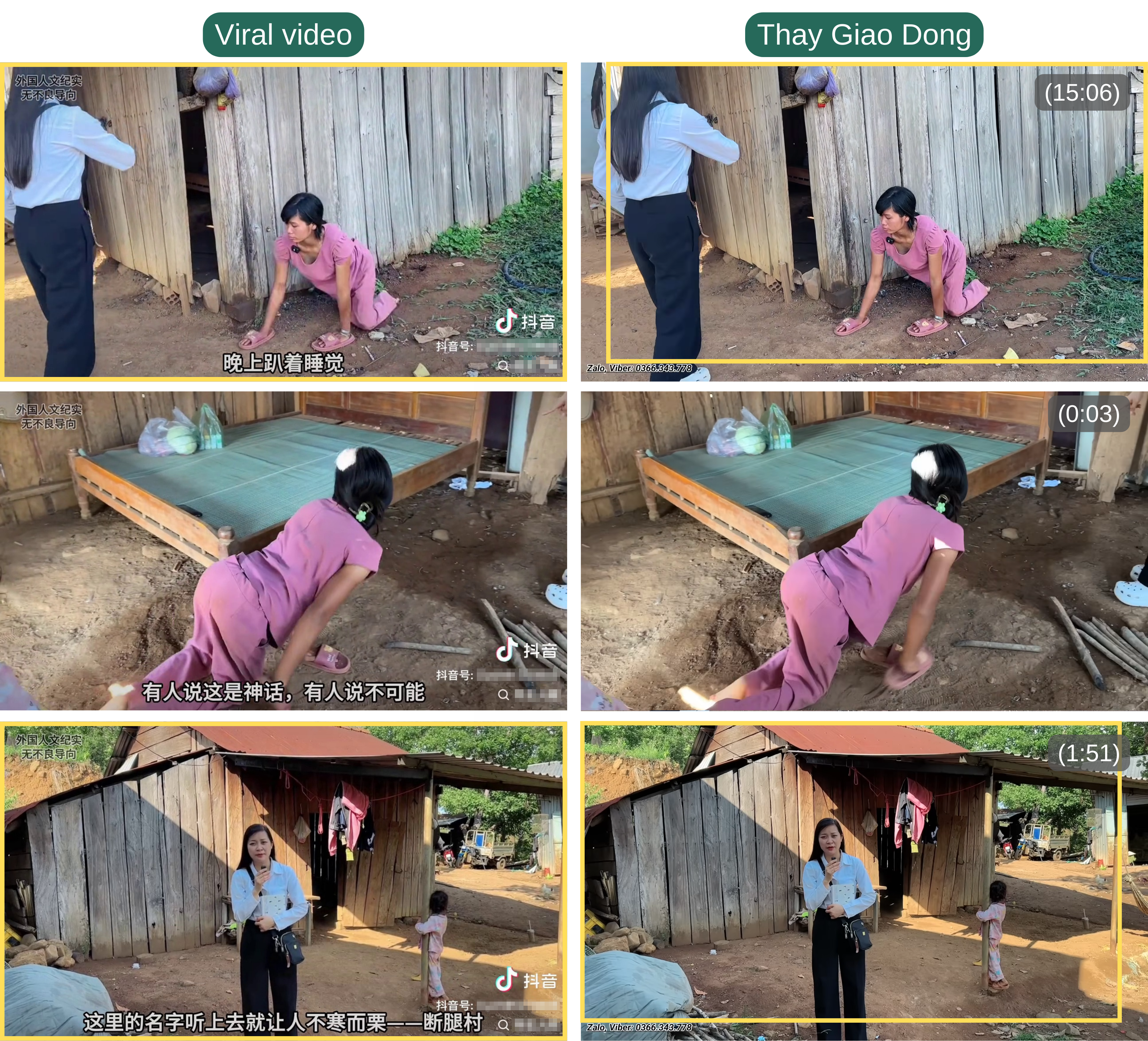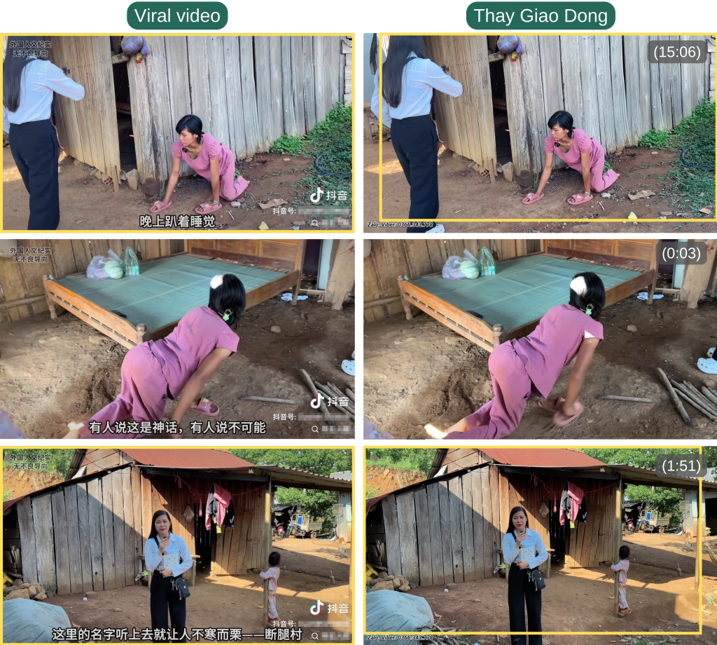 Several clips featuring Nhom in pink clothing in the viral video were taken from the footage posted on May 14, 2025, by the YouTuber Thay Giao Dong (“Teacher Dong”), at timestamps 15:06, 0:03, and 1:51 (in the order of their appearances in the viral video).
