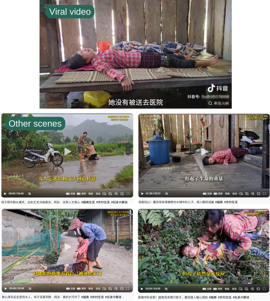 Further uploads Annie Lab has gone through show the same woman in different, possibly scripted, situations, consistent with a “daily life” series about single mothers in poverty, a popular genre in Vietnamese online video (screenshots below).