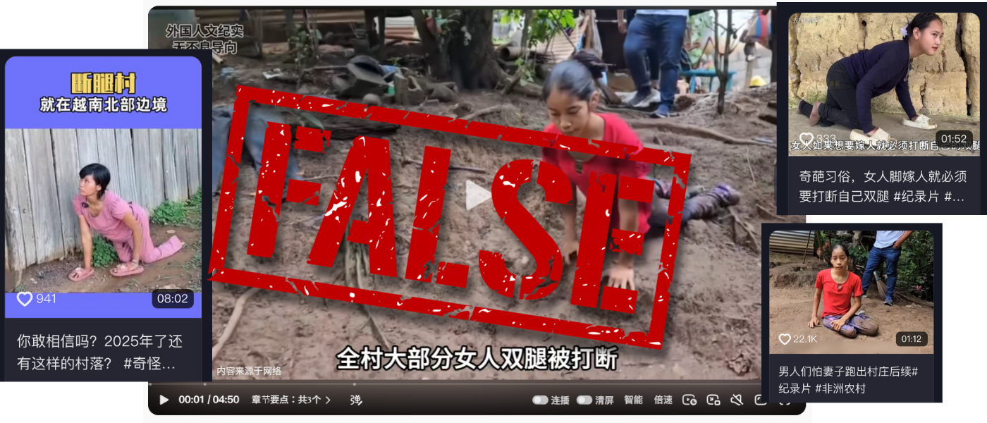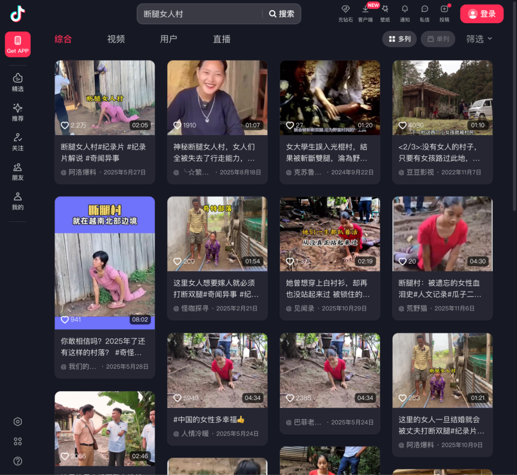 On Douyin, a search for the phrase “断腿女人村” (“village of broken-leg women”) returned dozens of uploads from different accounts, with many attributing women’s disabilities to a wedding “custom.” Some posts label the scenes as African, while others place them in northern Vietnam.