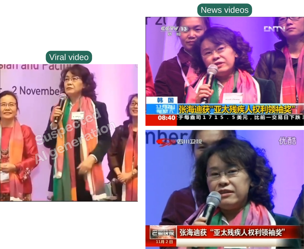 A video that purportedly shows Zhang Haidi (張海迪), a prominent Chinese writer and disability advocate, standing up from her wheelchair during an event went viral on social media in late October 2025.