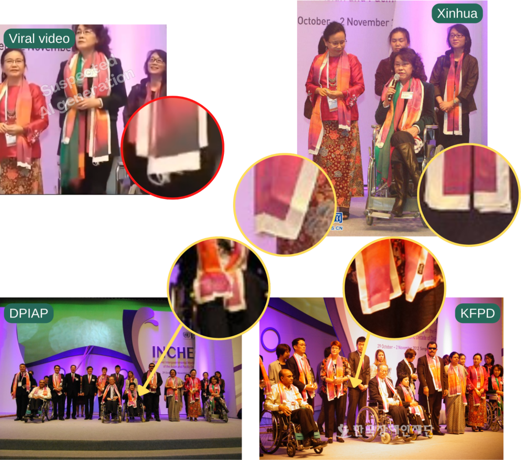 In genuine images, the multicolored ceremonial sashes worn by other award winners have distinct white borders on all four sides. In the viral video, however, Zhang’s sash appears distorted, missing its corners, which is a common artifact of AI rendering.