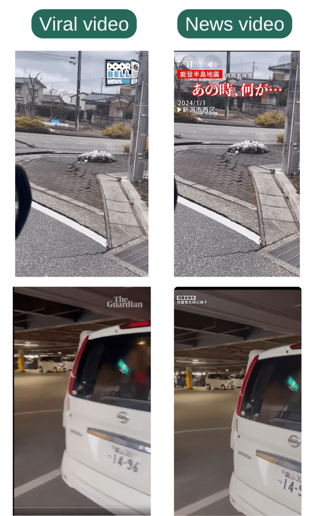 The second clip (from 0:13 to 0:51) shows vehicles shaking in a parking lot. It is identical to a YouTube video (archived here) published by MBS News on Jan. 2, 2024. Its description says the footage was captured at a shopping mall in Toyama Prefecture during the same quake.