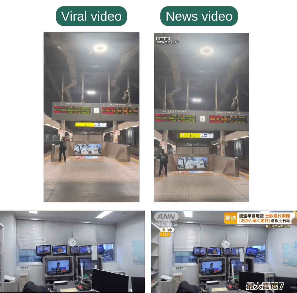 The third clip showing a train station departure board shaking violently matches another video (archived here) from JR Kanazawa Station posted by MBS News on Jan. 2, 2024.